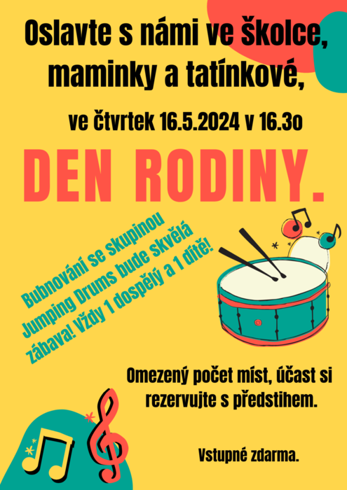 Zveme tímto dospěláky ze školky na "Bubnování se skupinou Jumping Drums", vždy 1 dospělý a 1 dítě k bubnu. Poslechnete si ukázku mistrů bubeníků, s nimi se pak společně naučíte zajímavé rytmy i vy. Počet míst je bohužel omezený, v případě zájmu si rezervujte místo u p. učitelek ve školce. Akce začíná v 16.30, přijďte s předstihem.