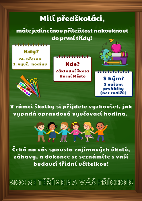 Spousta zajímavých úkolů a zábavy čeká na předškoláky v naší základní škole. Budou mít možnost nakouknout do běžné hodiny mezi prvňáčky a seznámit se i s paní učitelkou.