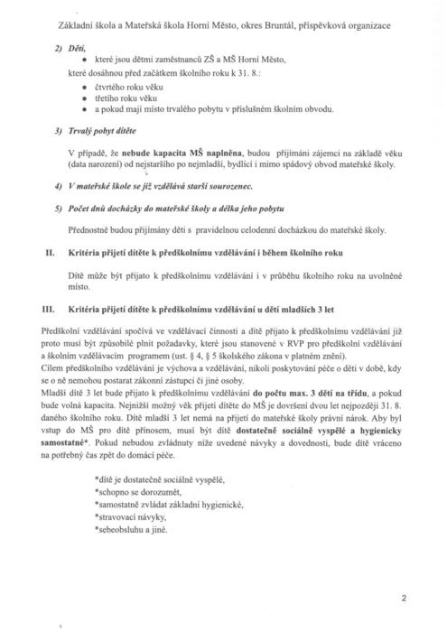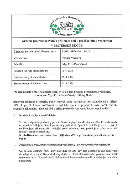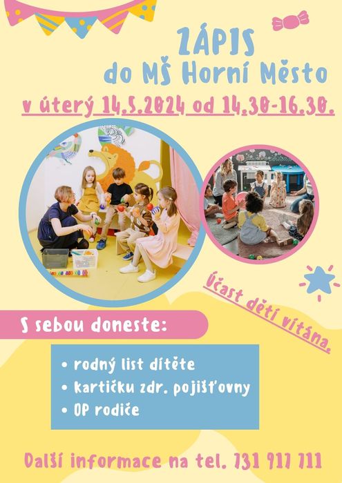 zveme Vás k zápisu do naší školky, který proběhne v úterý 14. 5. od 14:30 do 16:30 v budově MŠ Horní Město. Pozorně si, prosím, přečtěte přiložený dokument "Kritéria o přijímání dětí...".