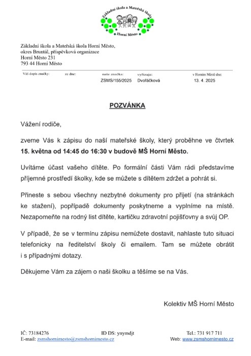Úvod > Mateřská škola > Aktuality MŠ > Zápis do MŠ