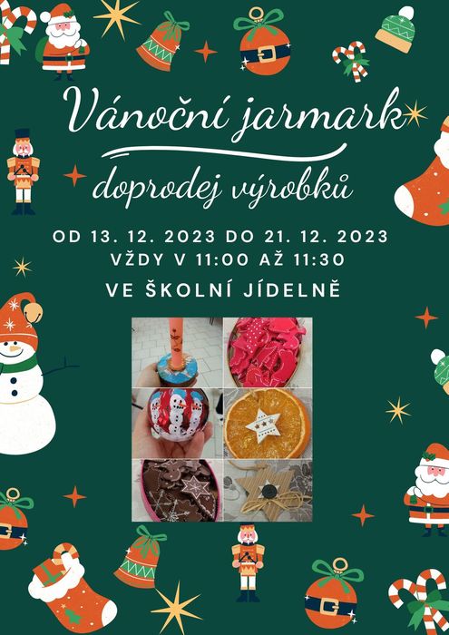Zveme vás na doprodej výrobků z Mikulášského jarmarku, který bude probíhat od 13. 12. do 20. 12. ve školní jídelně vždy v době od 11:00 do 11:30.????