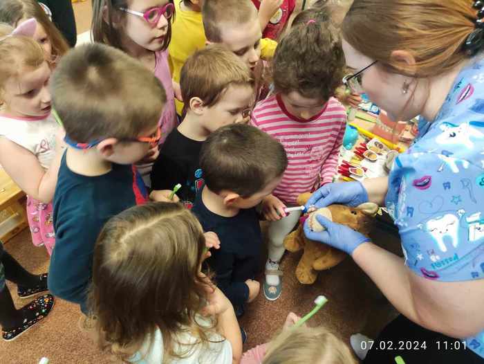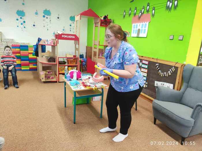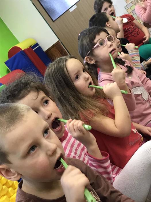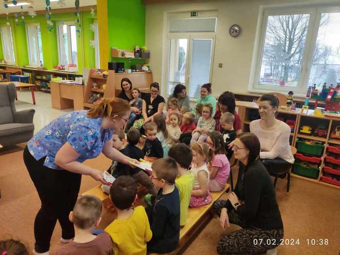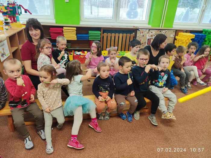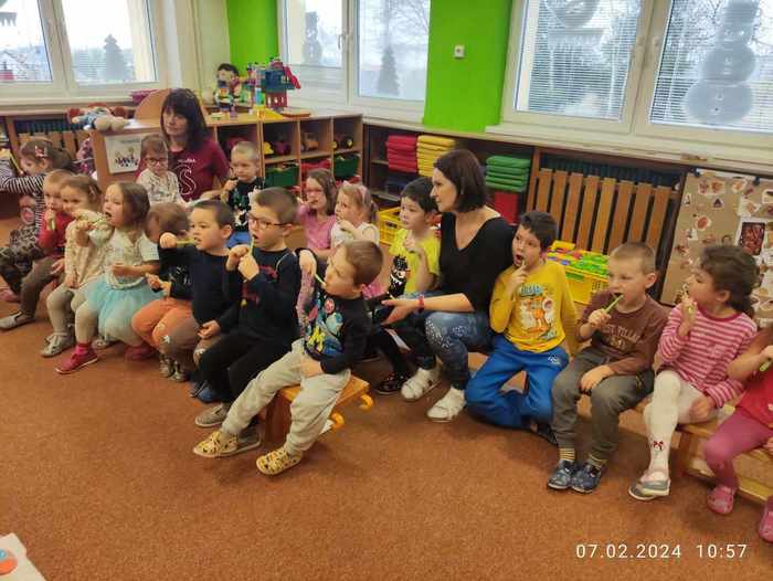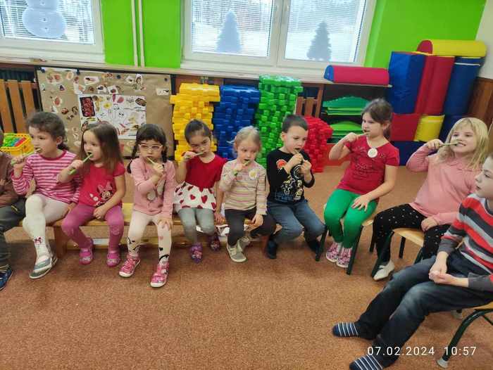Dnešní dopoledne proběhl ve školce projektový den zaměřený na povídání o zoubkách a správné péči o ně. Třídění zdravých a nezdravých potravin mají děti v malíčku, vyzkoušely si ale barvení plaku tabletou, prohlédly si spoustu zubních pomůcek. Shlédly také od odborníka ukázku správných technik čištění zubů a samy si je vyzkoušely. Zpestřením byla hra pexeso se zubní tematikou.