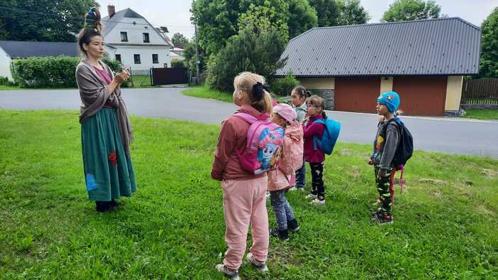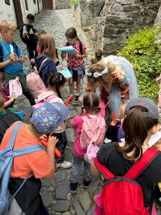A až se zase někdy na prohlídku hradu vrátíte, děti, třeba s rodiči, dejte si pozor na skřítky Ryšavěnku, Borůvinku, Hospodárníčka, Povídálka či Skřehotálka.