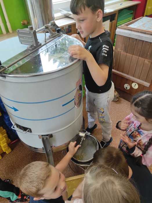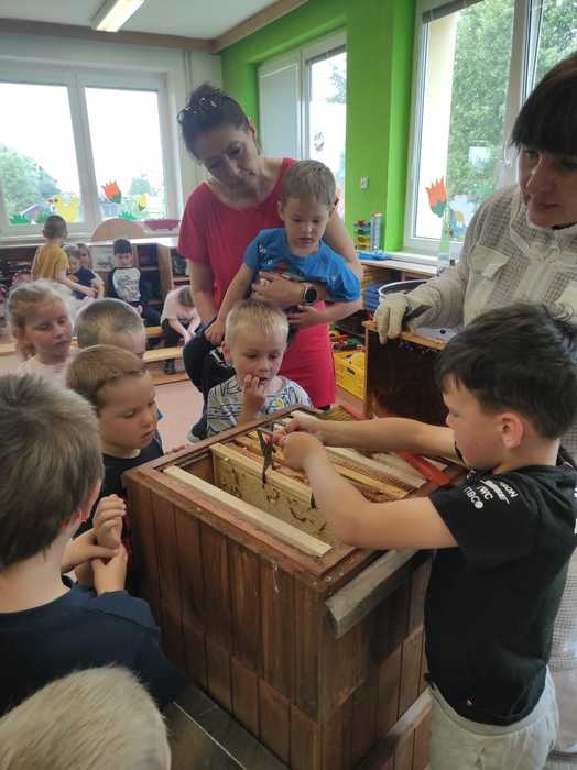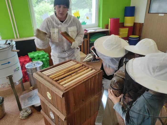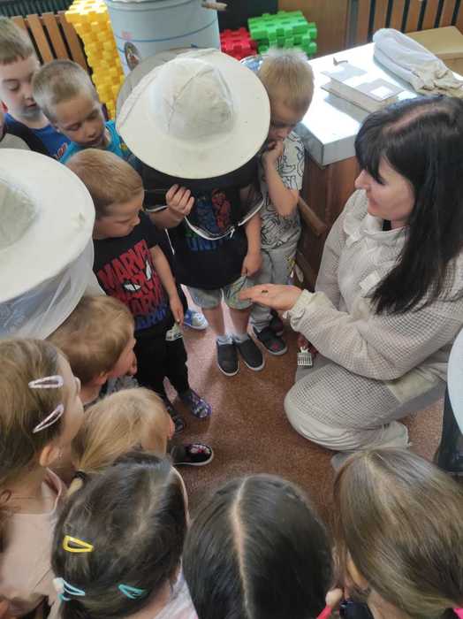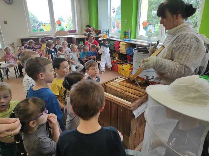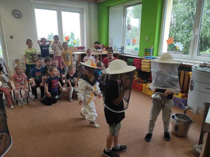 Děti si na vlastní kůži vyzkoušely přísloví „být pilný jako včelka“, kdy se seznámily s hierarchií včelstev a úkoly každé včelky v úlu. Paní Havelková přinesla s sebou tolik reálných pomůcek – děti si vyzkoušely včelařskou kombinézu, zapálili jsme dýmák, prohlédly si úl a vyzkoušely vytočit med v medometu. Sladkým zpestřením byla samozřejmě ochutnávka medu. Děti se dověděly zajímavosti o včelařství všeobecně, o chovu včel, užitku pro člověka i medicínu a něco také o včelích produktech.