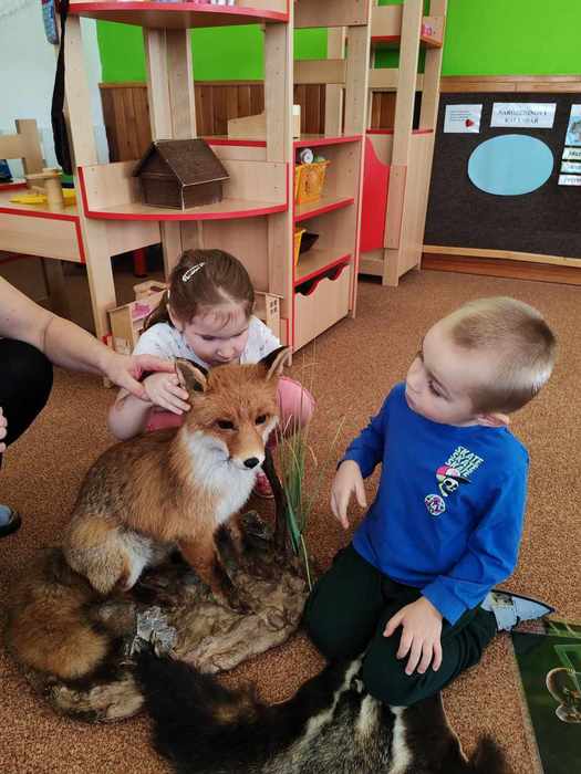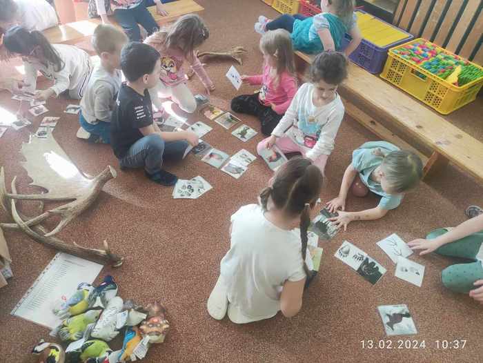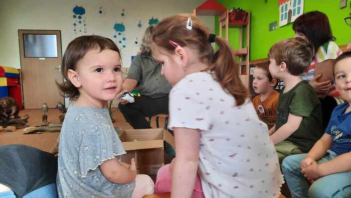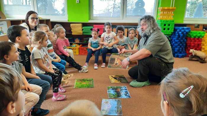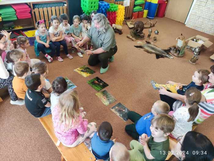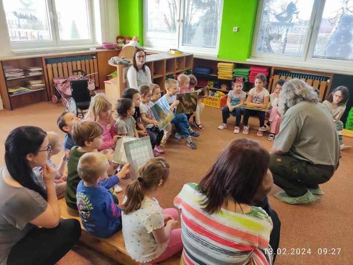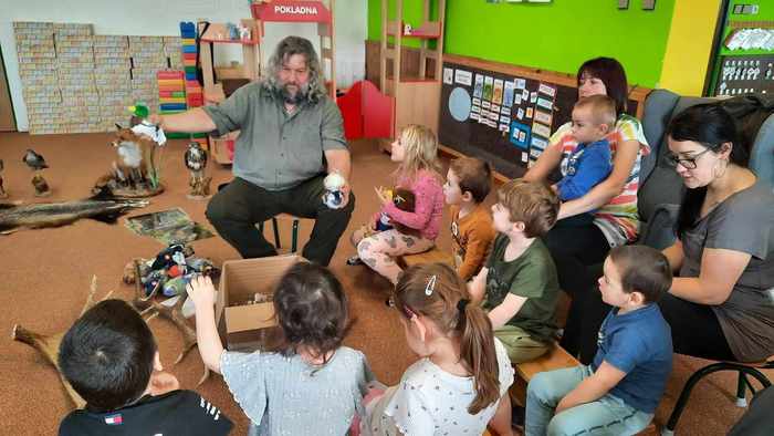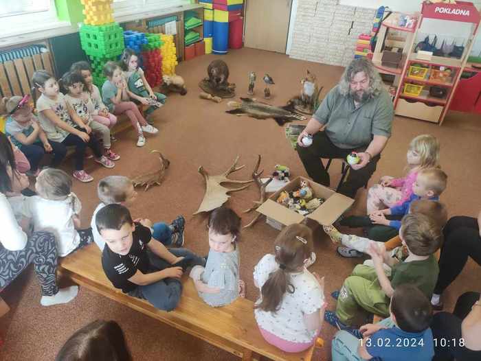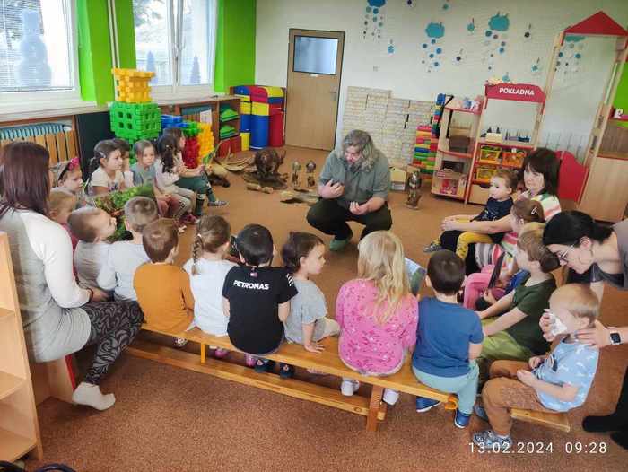 V rámci projektových dnů proběhla v naší školce další inovativní vzdělávání-beseda s revírníkem panem Gajdošem na téma "Zvířátka v lese". Děti se dozvěděly něco více o životě lesních zvířat, o jejich přirozeném prostředí, o stravě, nové informace směřovaly také k pochopení vzájemného soužití člověka a lesa. Zajímavým zpestřením bylo poznávání hlasů ptactva na krásných barevných plyšácích. Poutavé povídání bylo proloženo přiřazováním stop ke zvířatům, mladší děti se zabavily hledáním stínových obrázků.